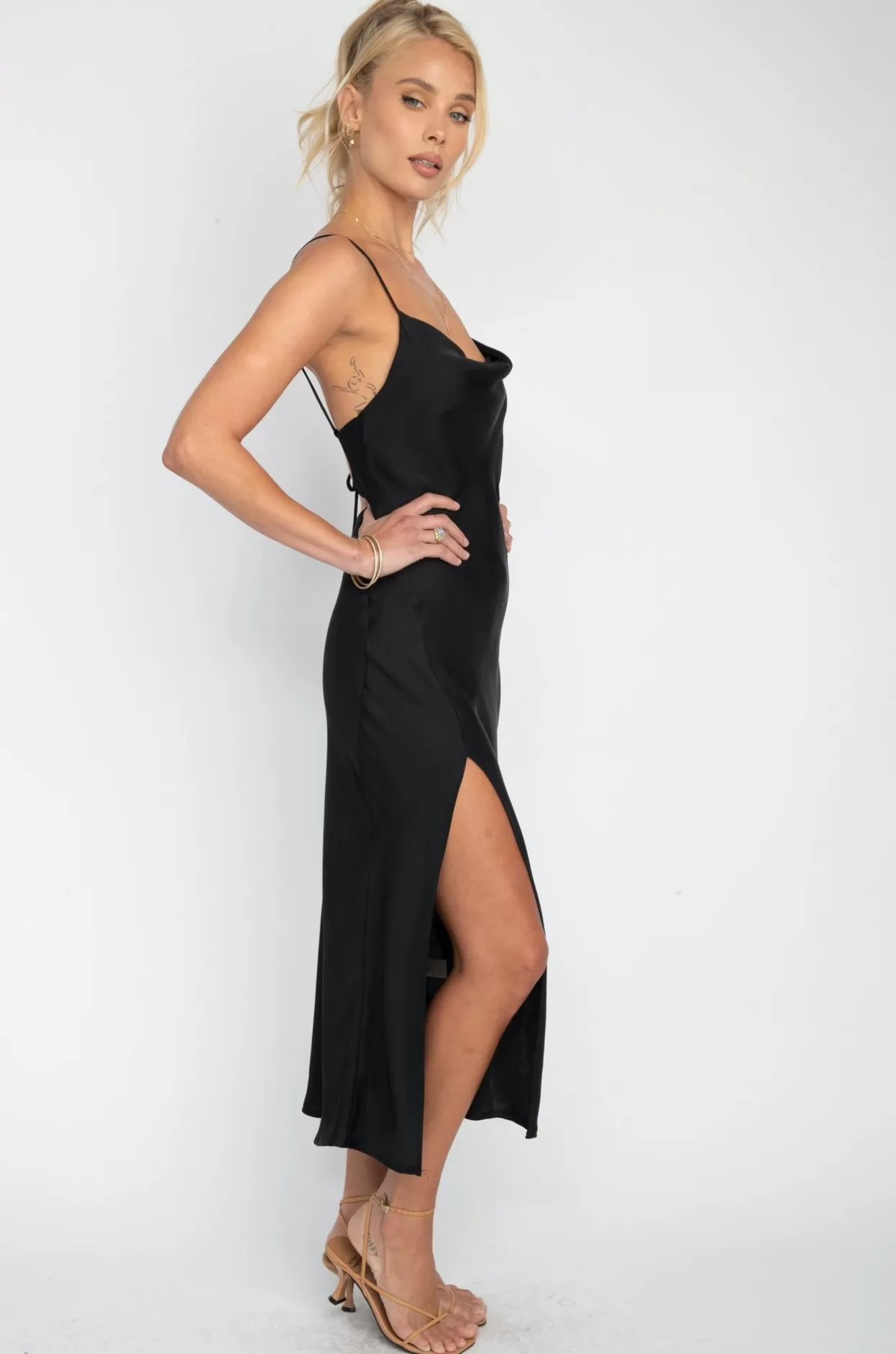- Cowl Neckline With High Leg Slit