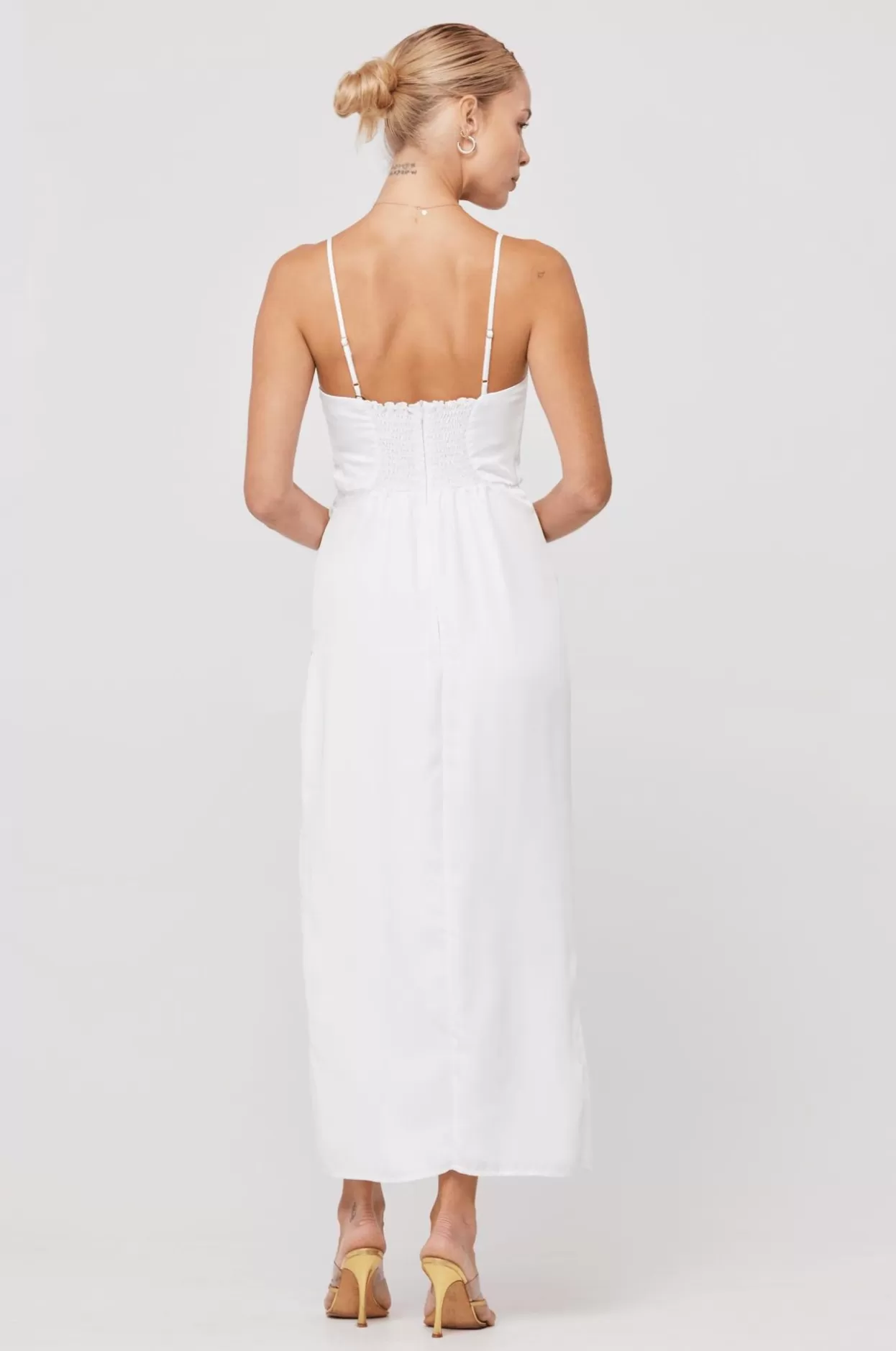 Adjustable Spaghetti StrapsZipper Up Center Back Closure With SmockingHigh Leg Slit With Side ShirringFully LinedFabric:…