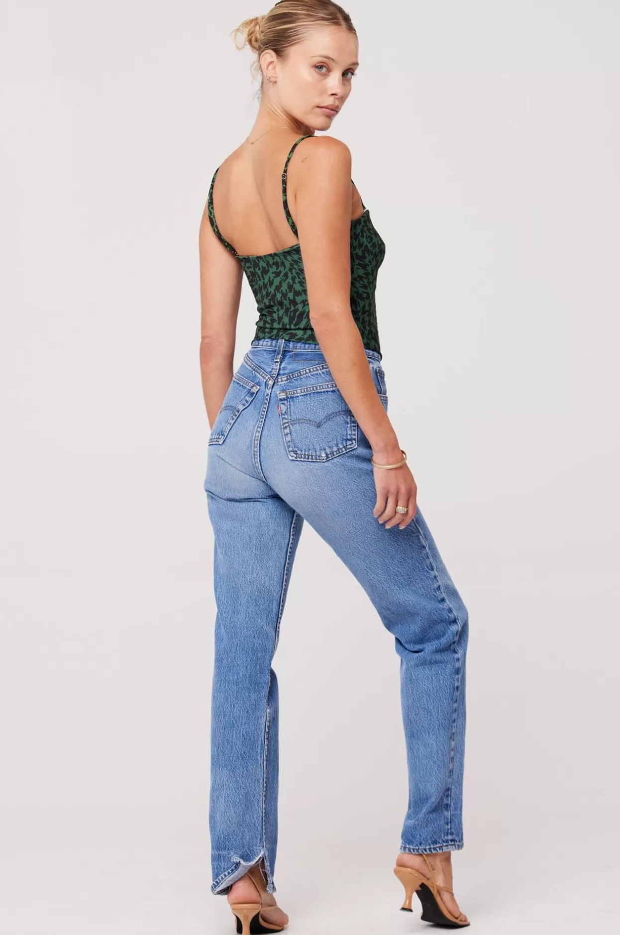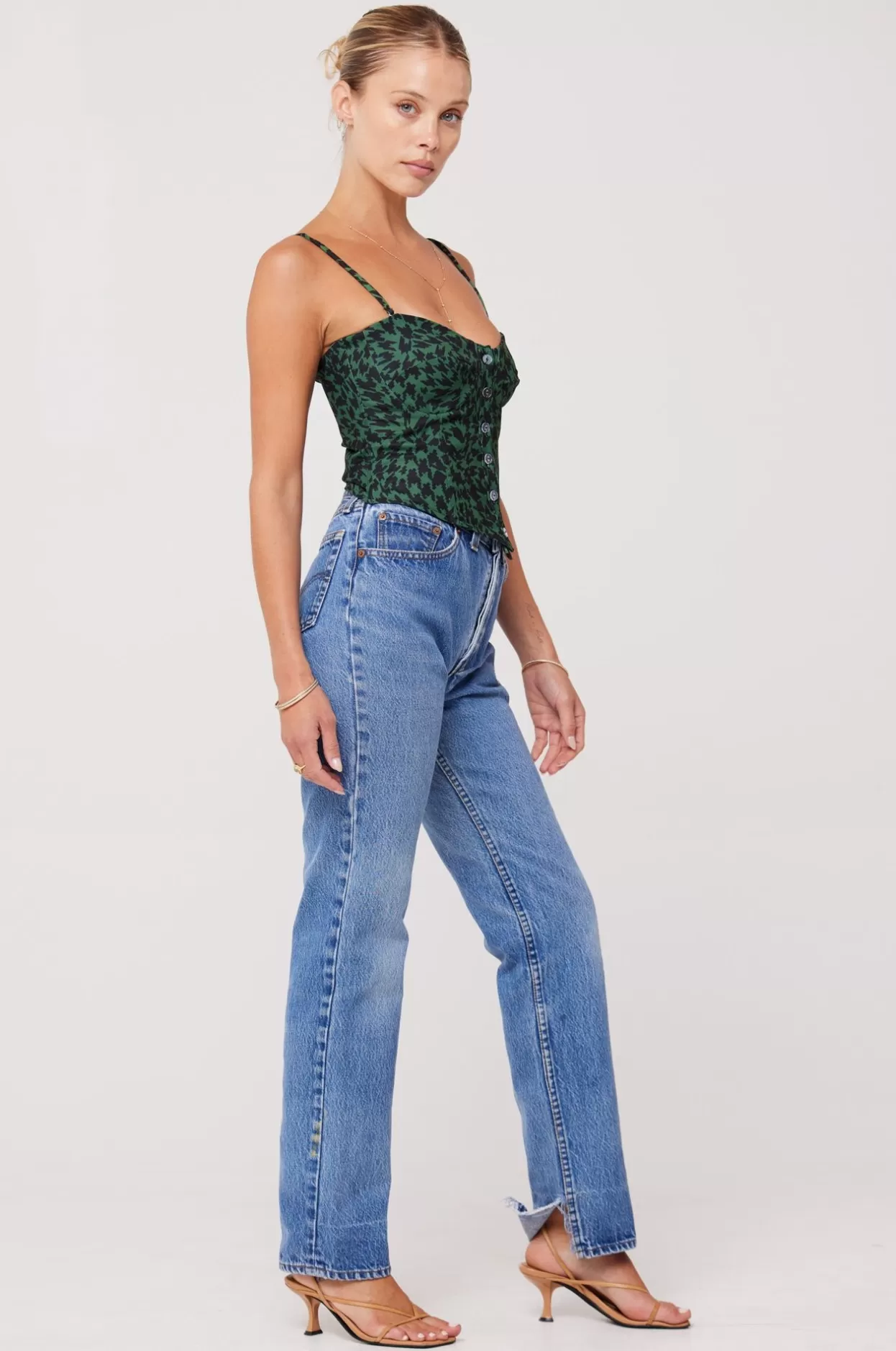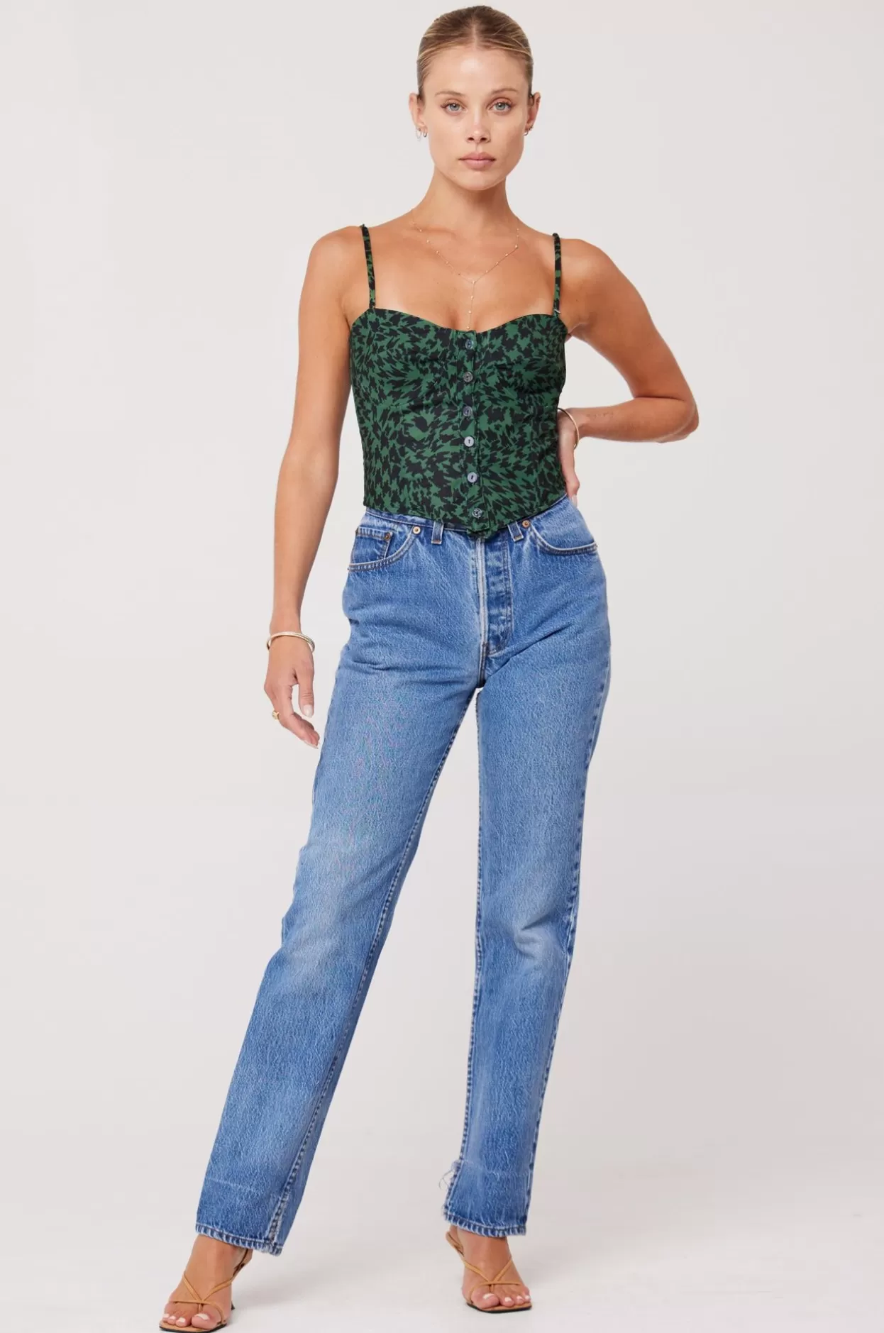 - Model Measurements: Height: 5’7, Bust: 32B, Waist: 25″, Hips: 34″