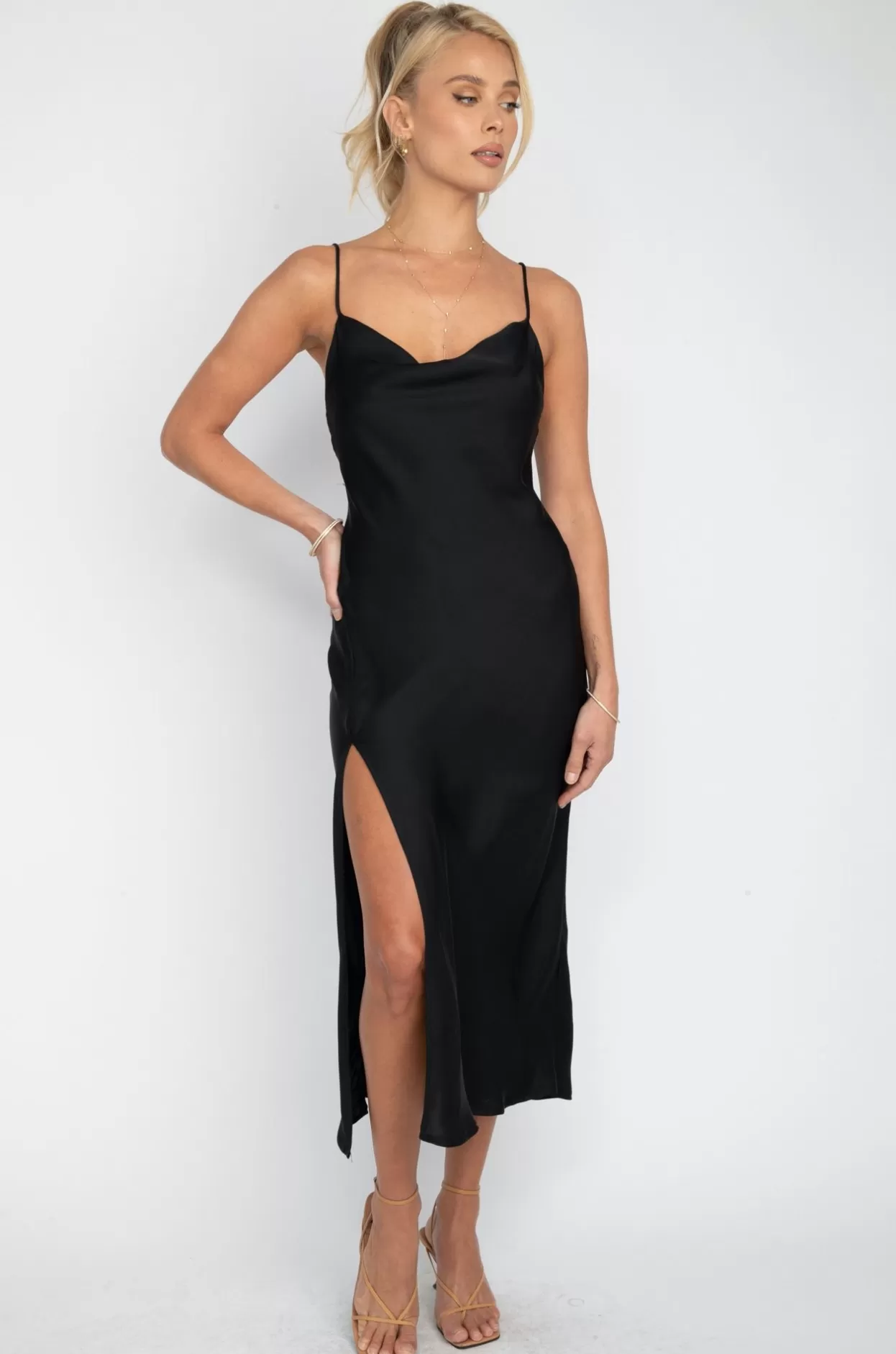 - Cowl Neckline With High Leg Slit