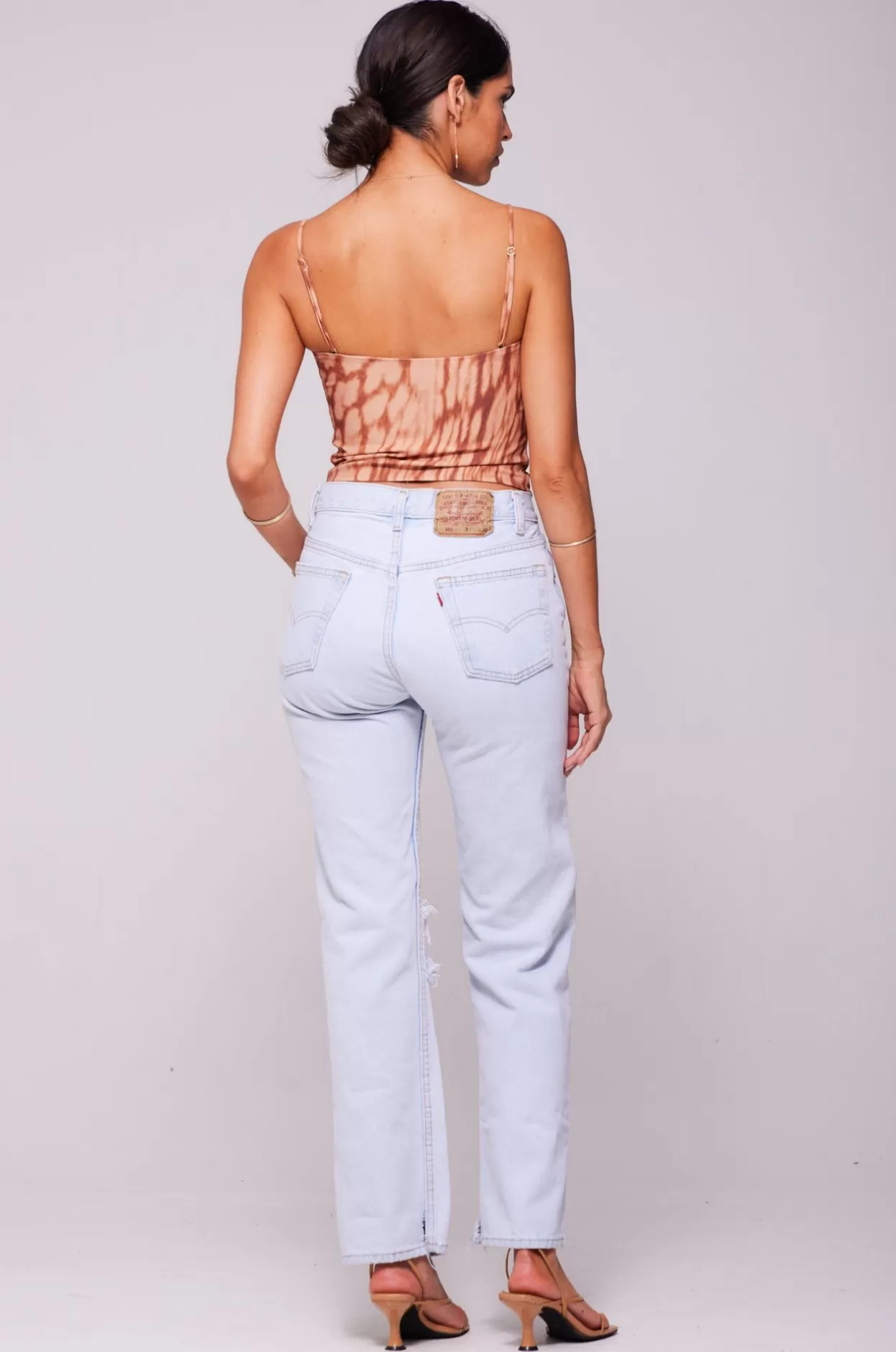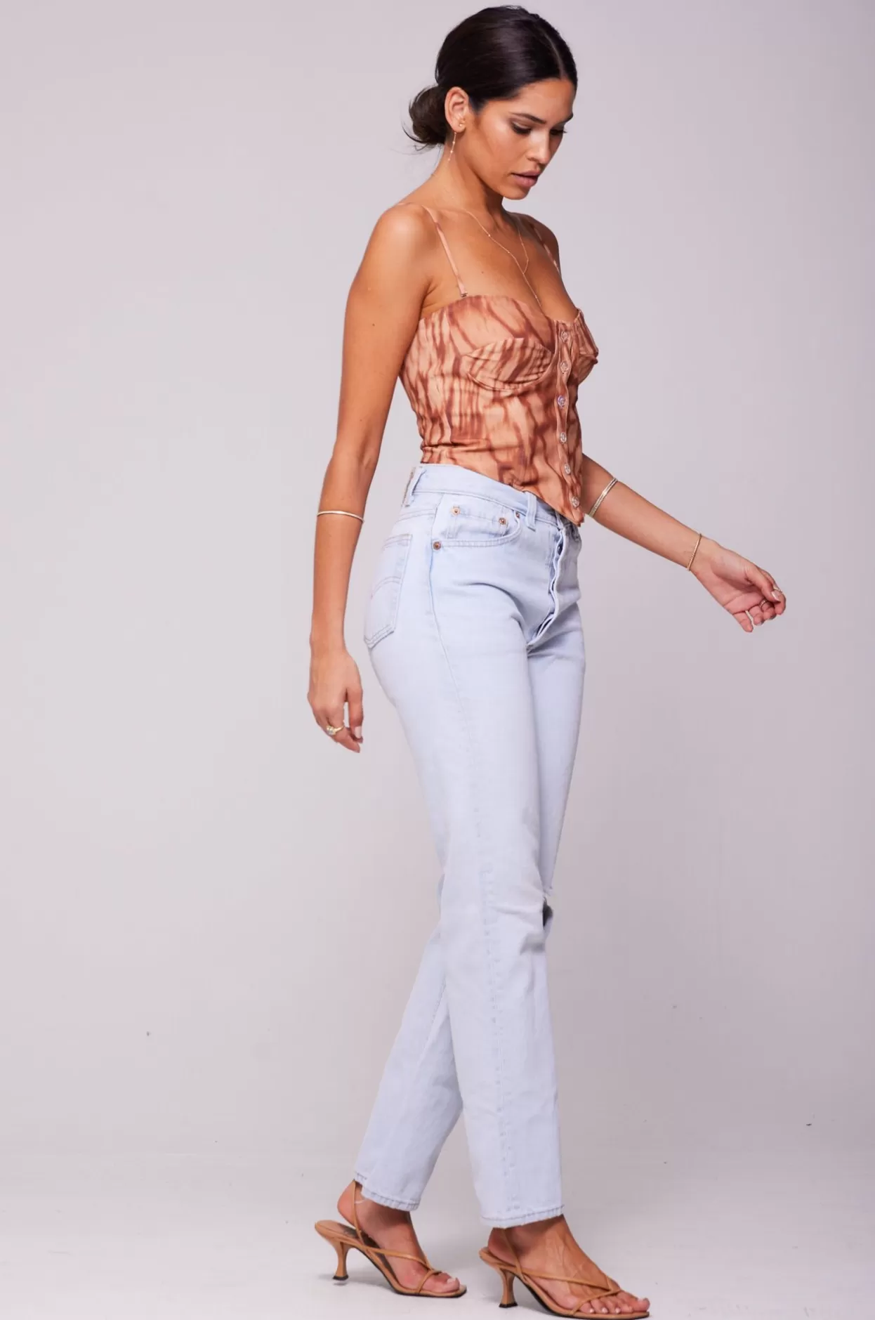 - Model Measurements: Height: 5’8, Bust: 32B, Waist: 25″, Hips: 35″