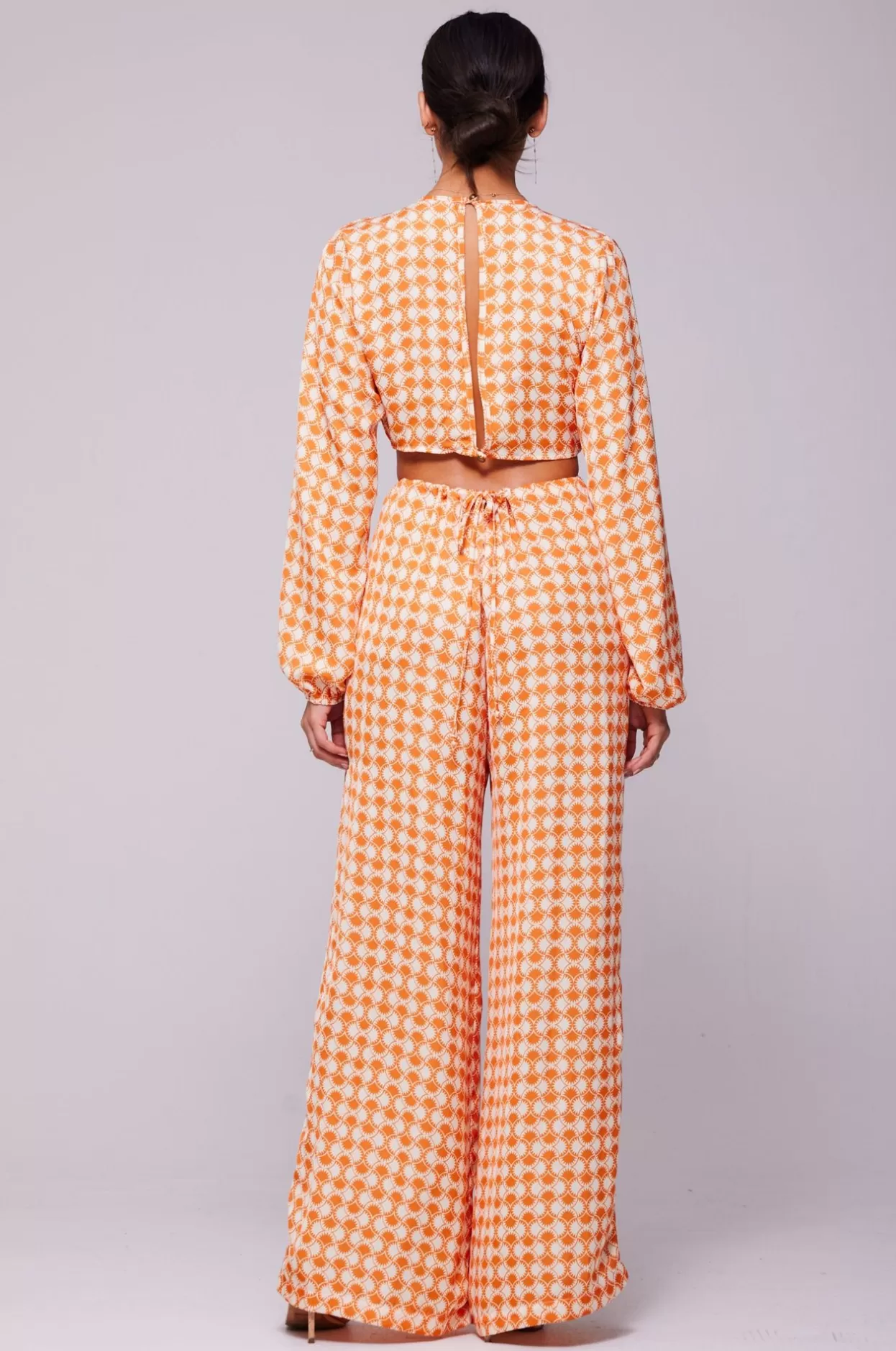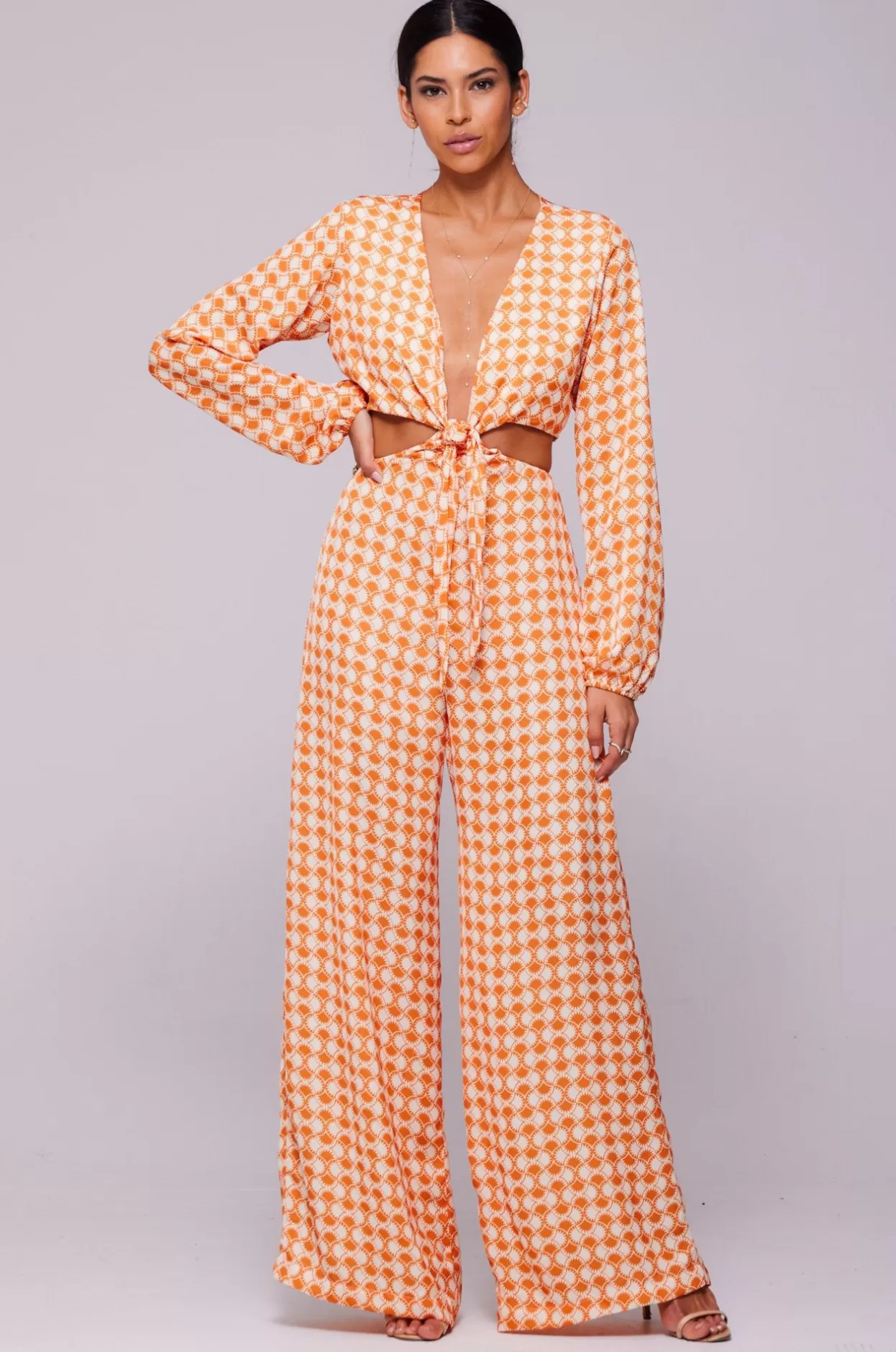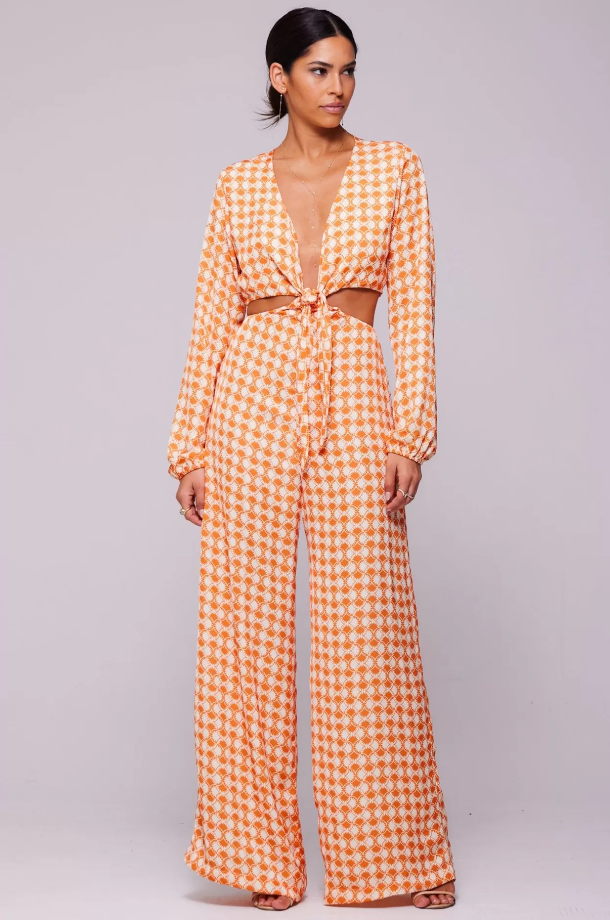 Adjustable Front Tie Neckline With Button Back ClosureDeep V Neckline With Wide Leg PantAdjustable Spaghetti Tie Back Cl…