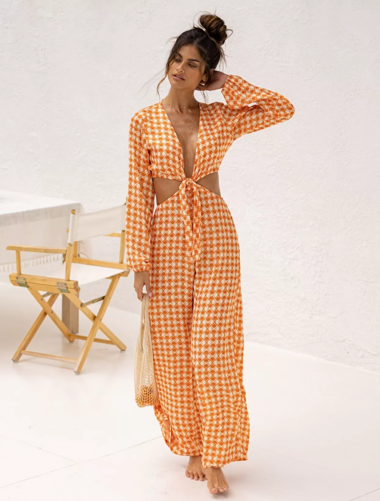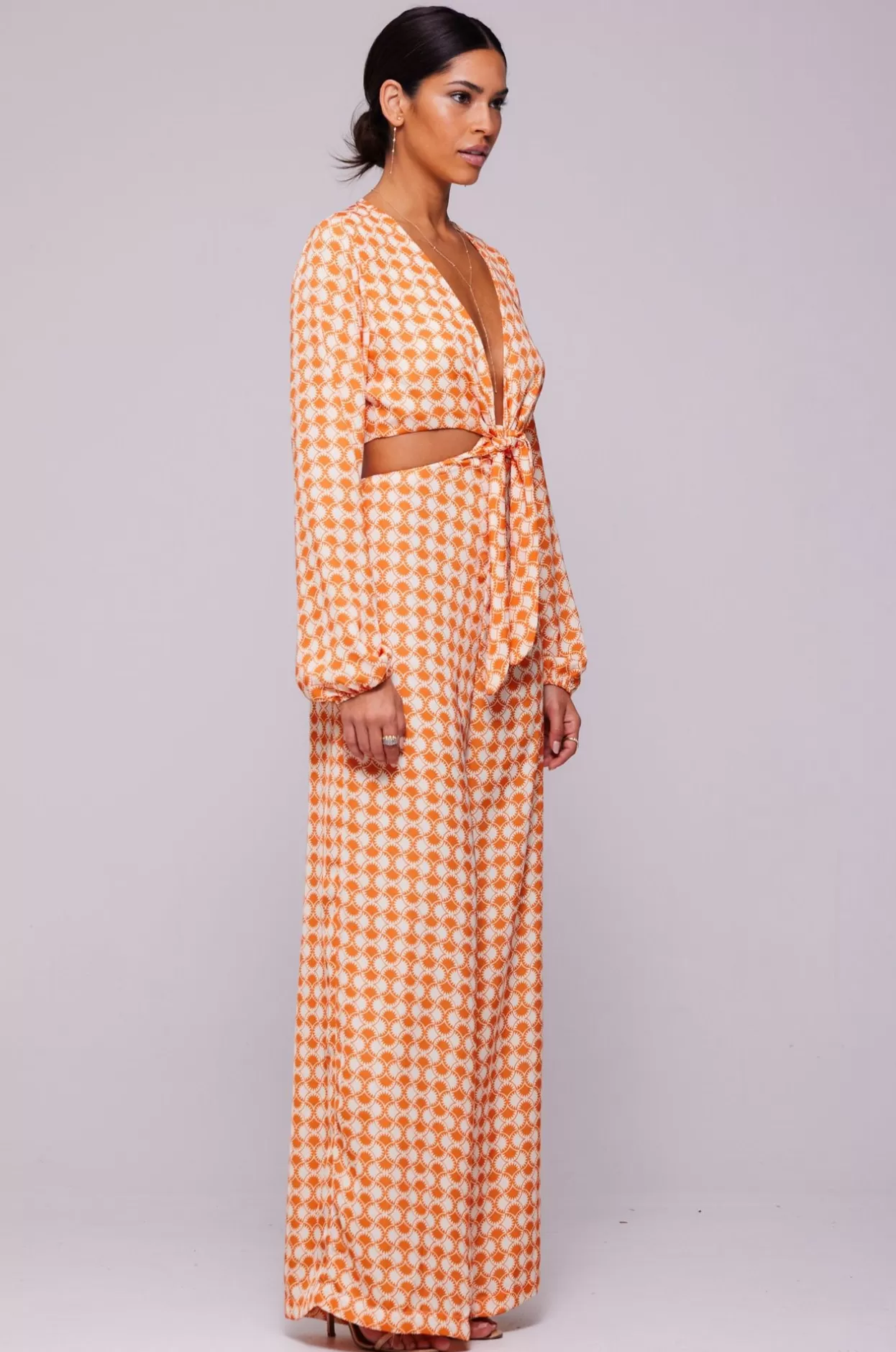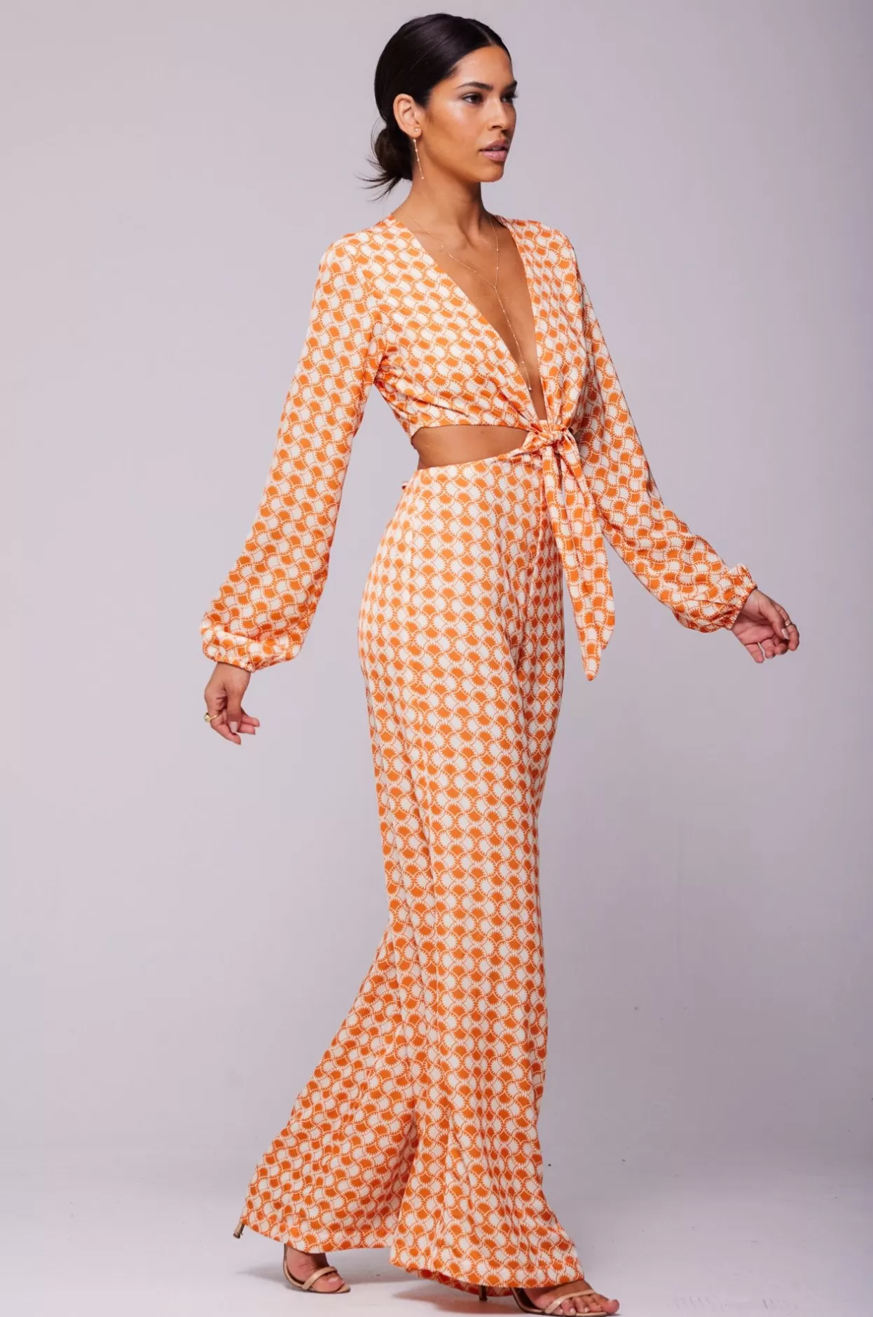 Adjustable Front Tie Neckline With Button Back ClosureDeep V Neckline With Wide Leg PantAdjustable Spaghetti Tie Back Cl…