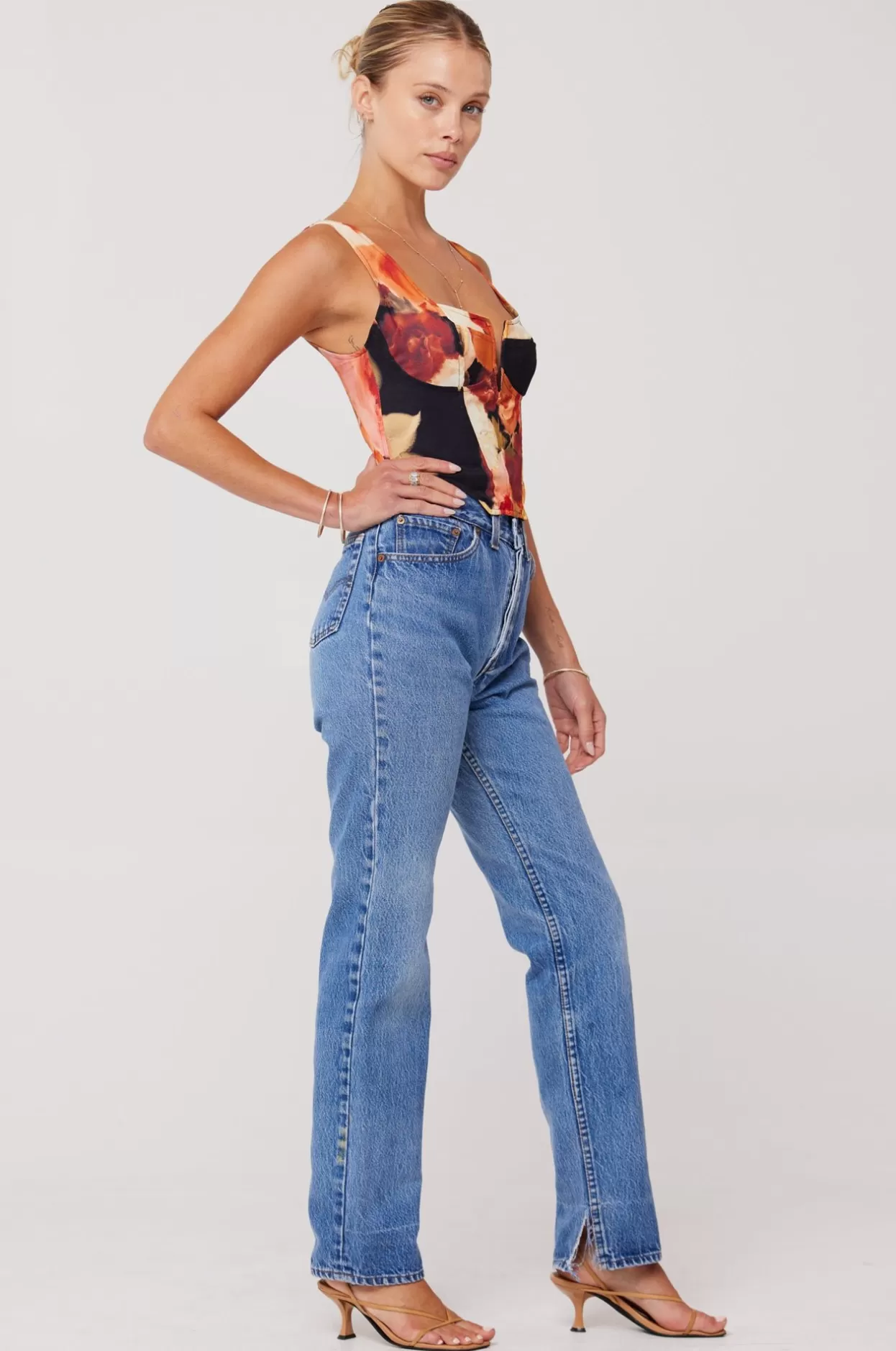 - Model B Measurements: Height 5’8, Waist: 30″, Hips 42″